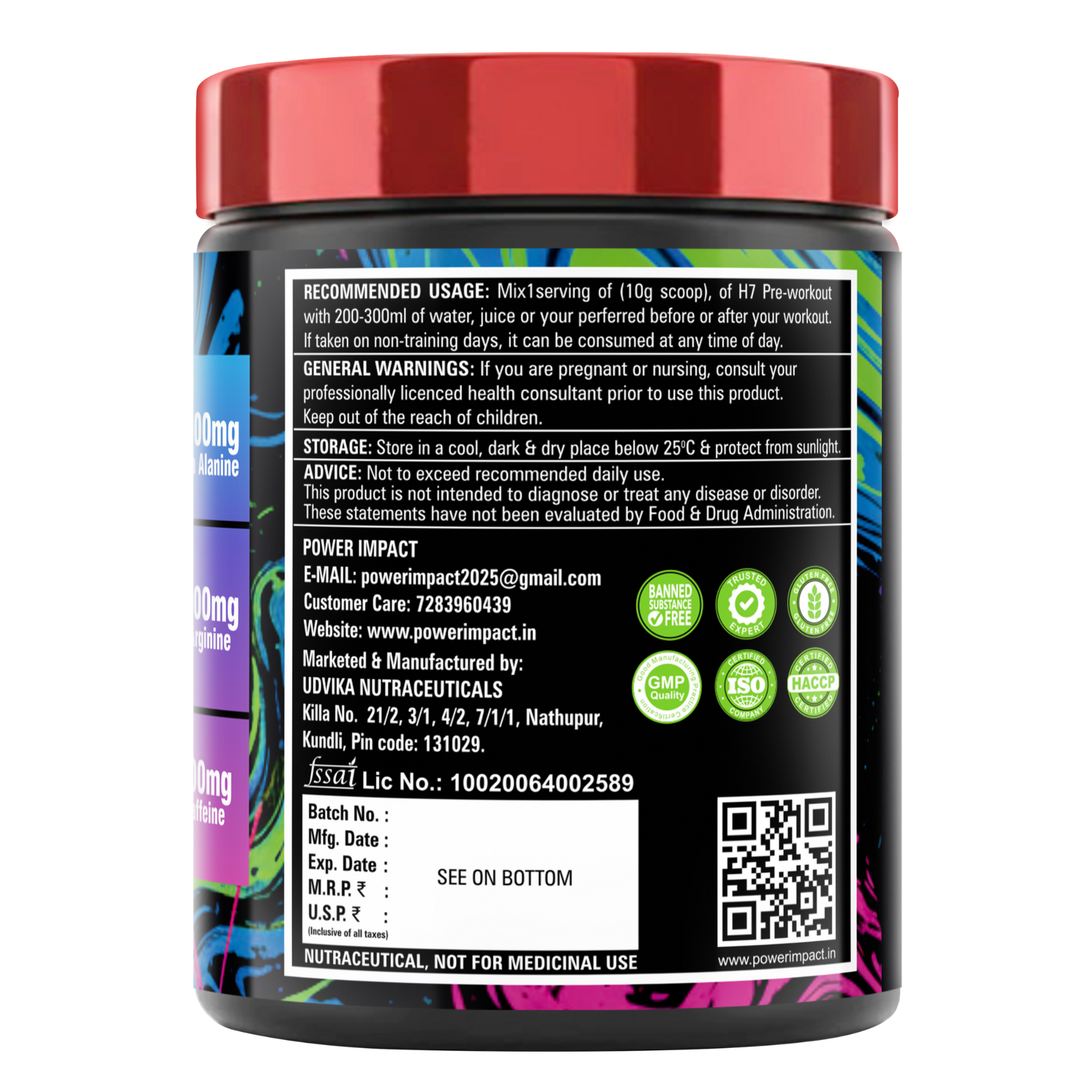 Power Impact H7 Pre-Workout is a high-performance energy and pump amplifier formulated for athletes, gym-goers, and fitness enthusiasts who demand more from every training session. With a powerful blend of Beta Alanine, L-Arginine, and Caffeine, this formula boosts energy, sharpens mental focus, and elevates muscle pumps for intense, productive workouts.